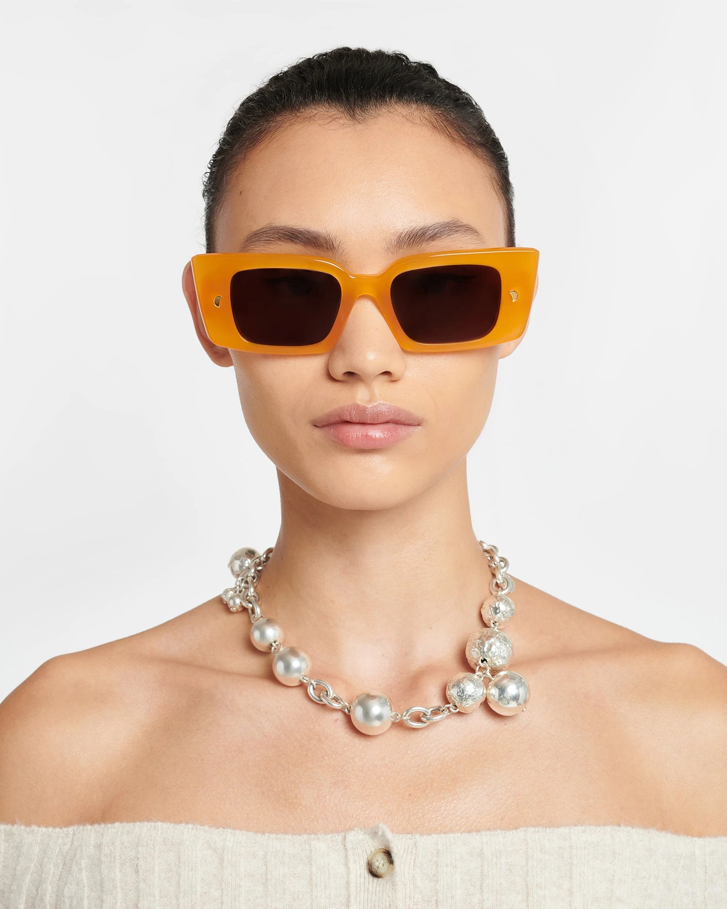 The Carmel sunglasses are defined by bold, rectangular frames. They are made from glossy orange bio-based materials and are detailed with gold-tone hardware at the temples.