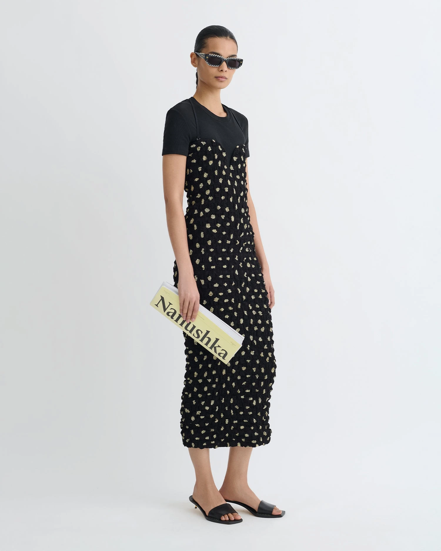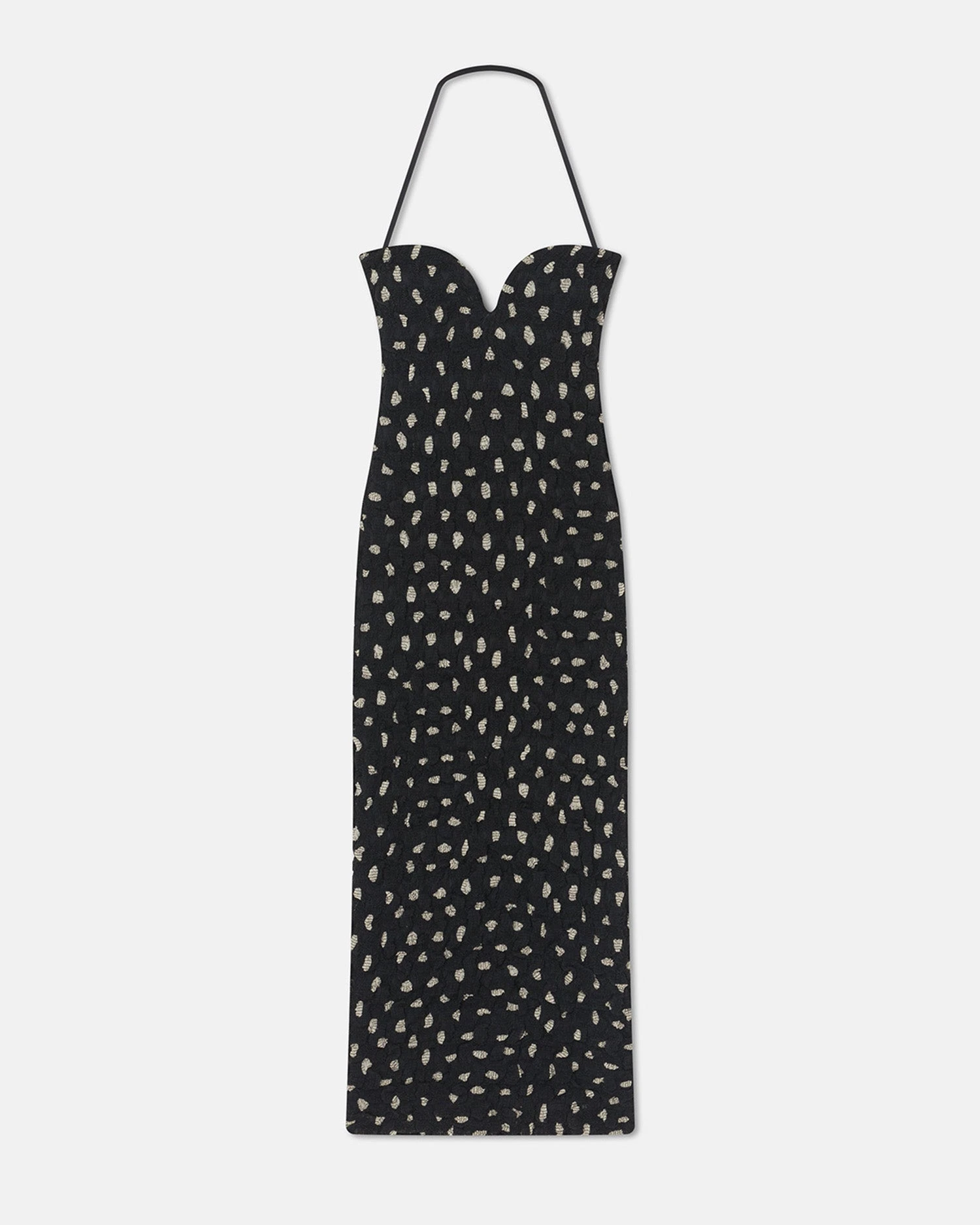 The Haylen dress demonstrates our innovative craft techniques. In a new, textured fabrication, it’s made from seersucker tech chiffon decorated with polka dots and has a halterneck sweetheart neckline to sculpt your frame. It falls to a midi length with a side slit.