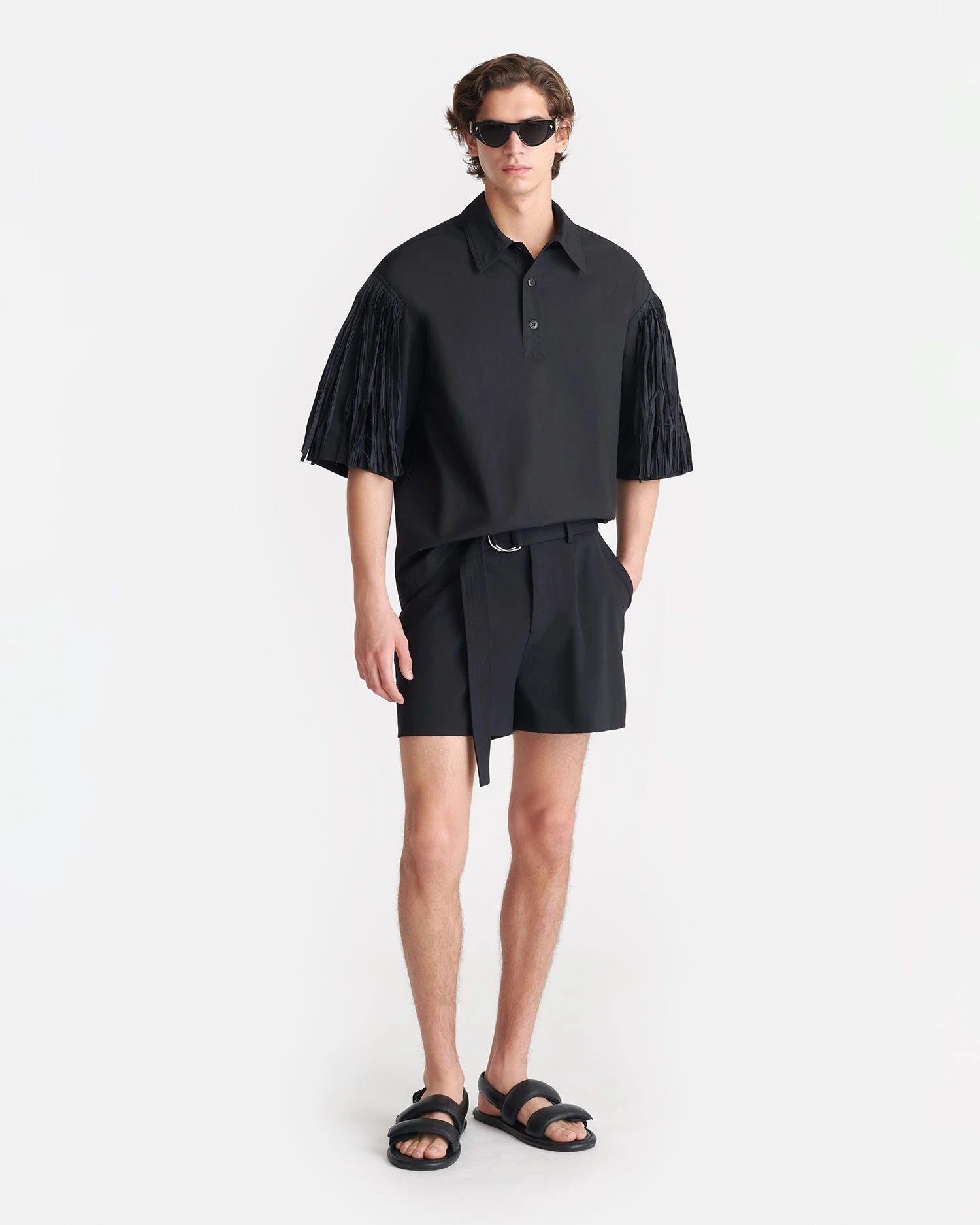 The Ilian shirt demonstrates our love of fabric manipulation. It is made from heavy poplin with fringed tech poplin sleeves for subtle texture difference.