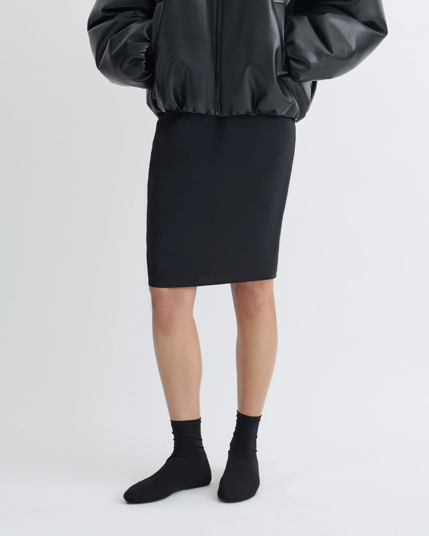 The Kaiya skirt epitomises understated sophisticated. It’s made from black glass poplin with a subtle sheen and falls in to a streamlined knee-length silhouette – the perfect counterpoint to the smocked silhouette of the Rosey top.