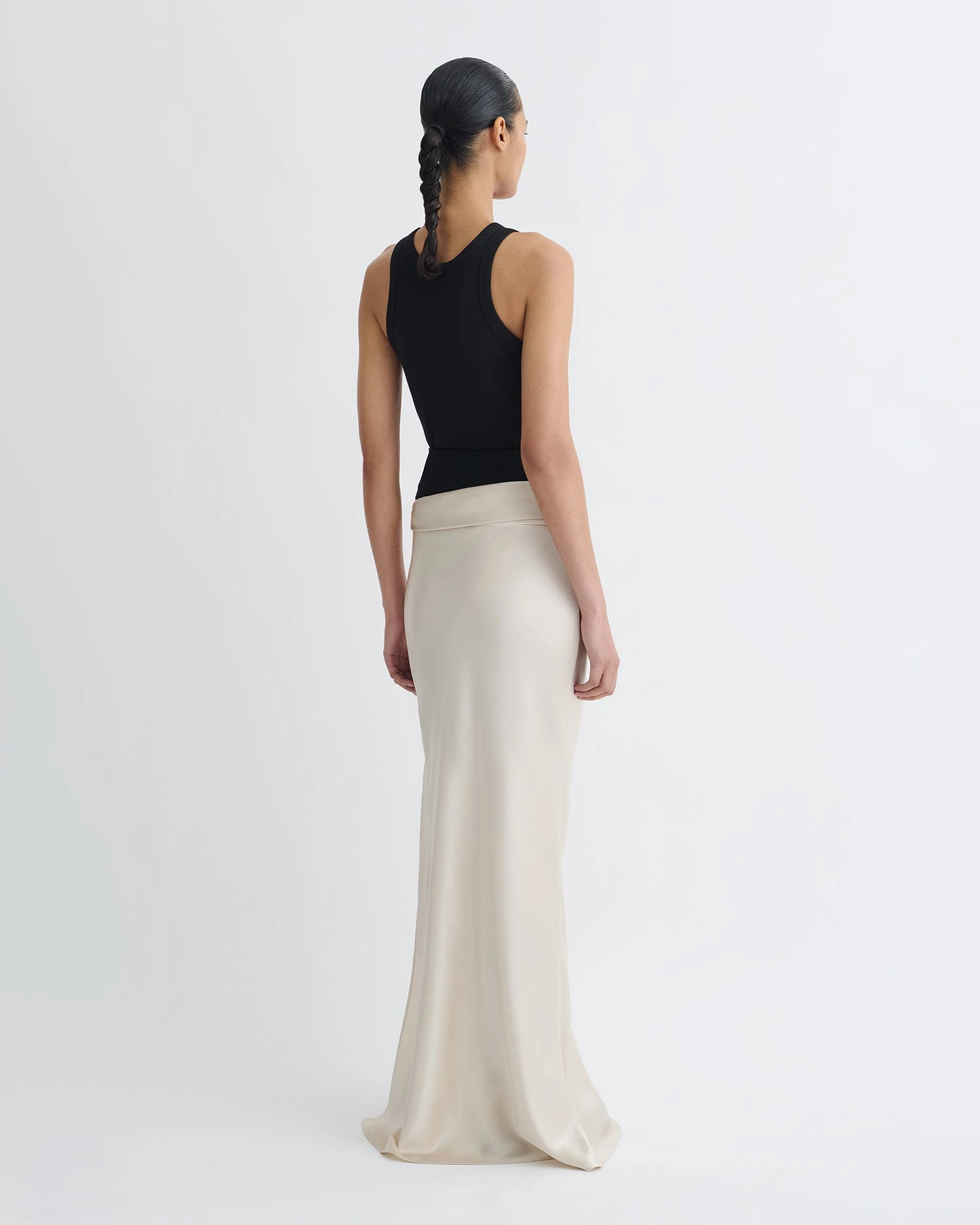 We love fabric blocking for the way it balances ease with elegance. The Letto dress is made up of a black mesh jersey waist and creme slip satin skirt – the draped waist is super flattering.