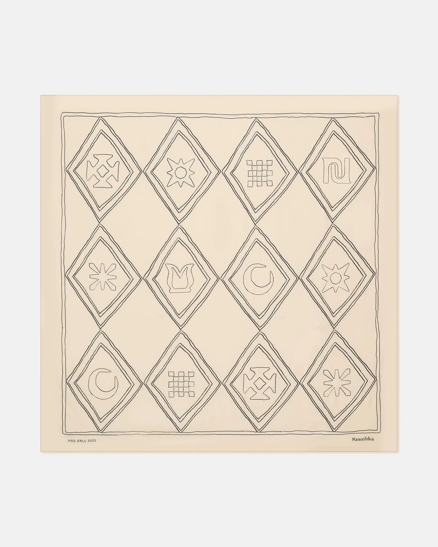 The Miani scarf is decorated with a Symbol Argyle print, an array of motifs inspired by traditional Hungarian kopjafa motifs. Made from silk, it can be styled endlessly, from around the neck and shoulders to looped round the handle of a tote.
