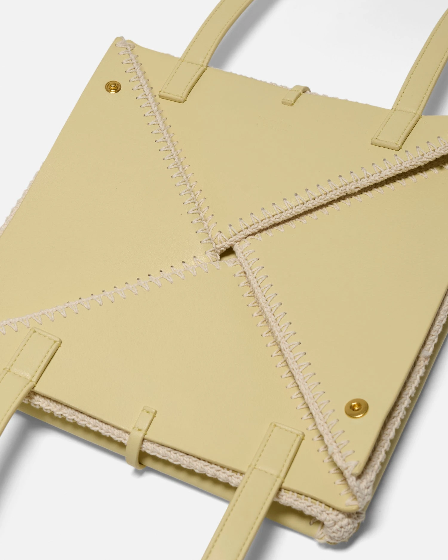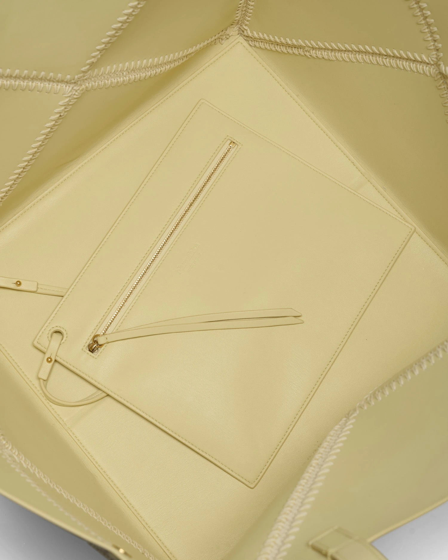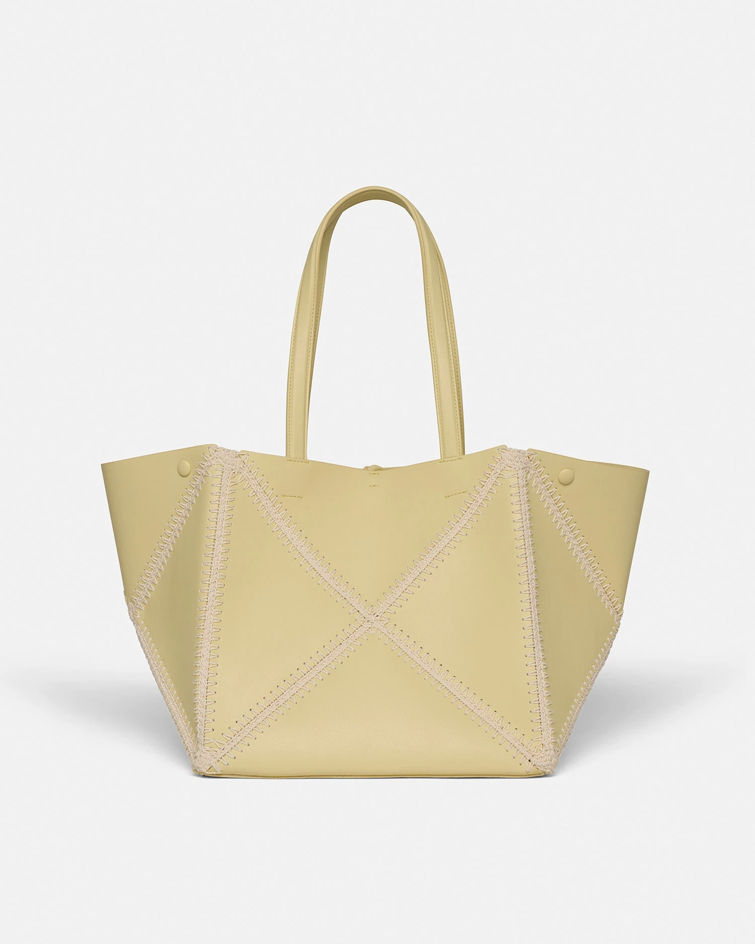 Origami tote folds completely flat to offer a functional solution for storing all your essentials, along with easy-to-carry shoulder straps. It is crafted from soft patent alt-nappa and detailed with contrast merrow stitching to create a patchwork effect.