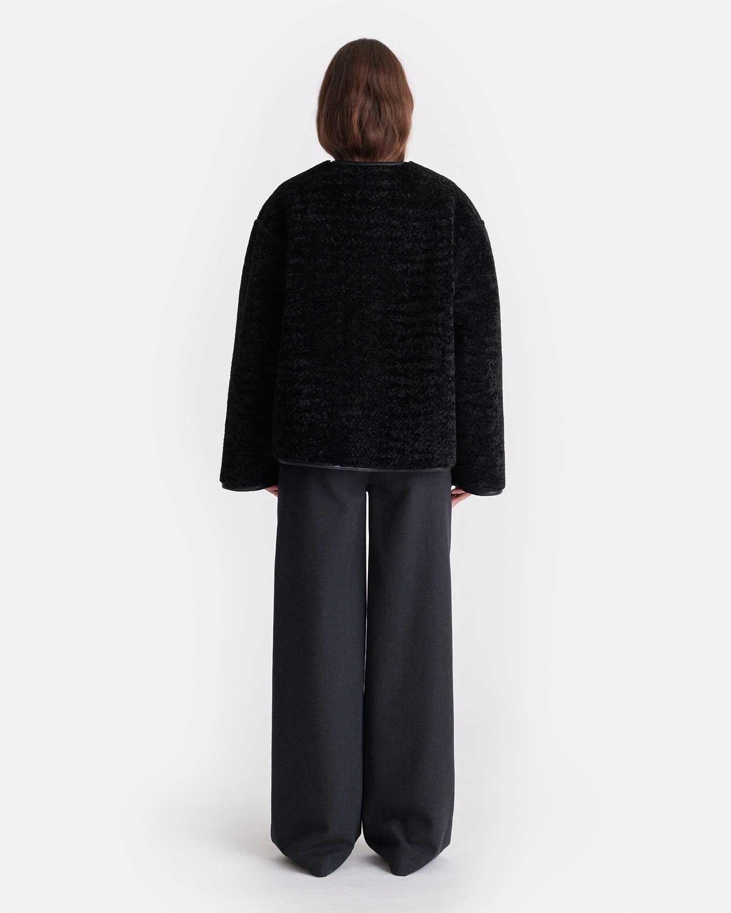 The Panka jacket is crafted from bonded shearling – switch between the smooth and textured sides for styling versatility. The hook and buckle fastenings and zip-up details reference classic Biker designs.