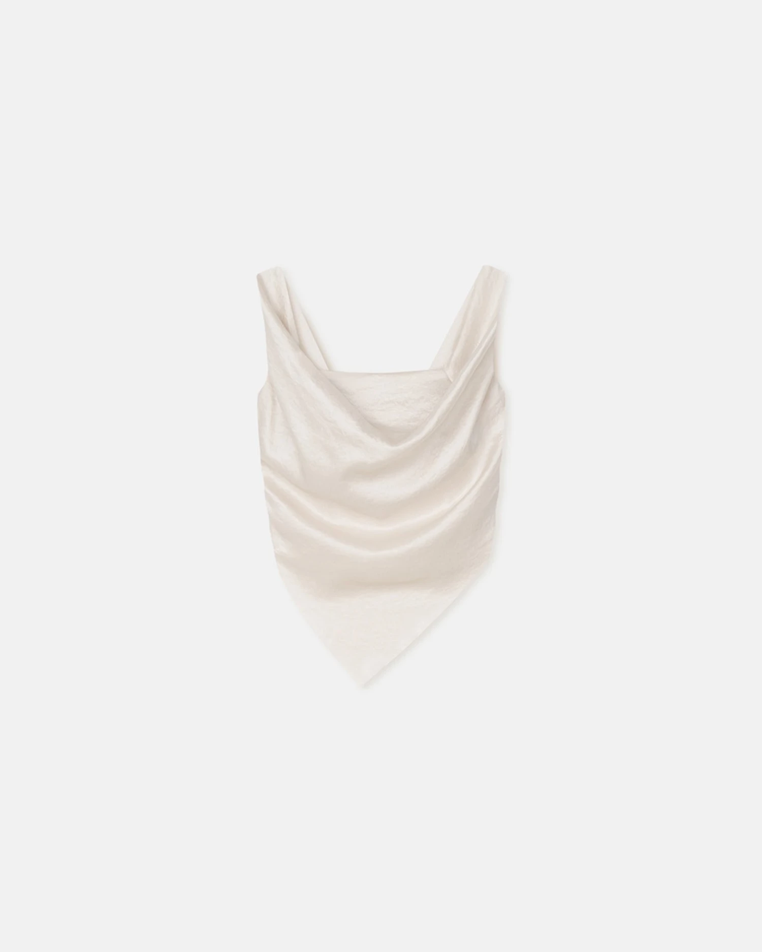 The Petra top is made entirely from upcycled washed satin in ecru. It falls into a draped silhouette and is further distinguished by wide straps and a scarf-inspired handkerchief hemline for effortless elegance.