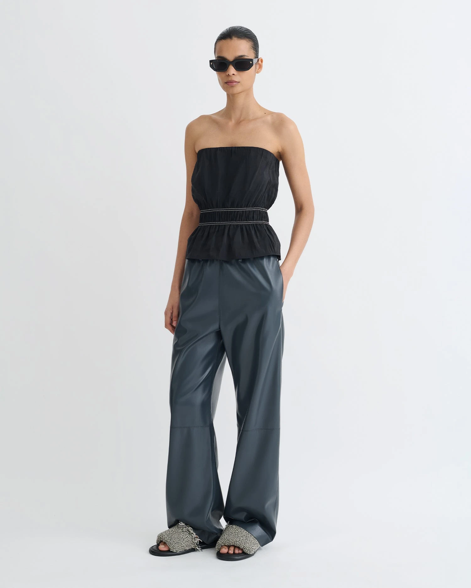 The Rosey top balances ease and elegance. It’s made from shiny glass poplin to create the smocked shape, with contrasting white stitching to highlight the waist.
