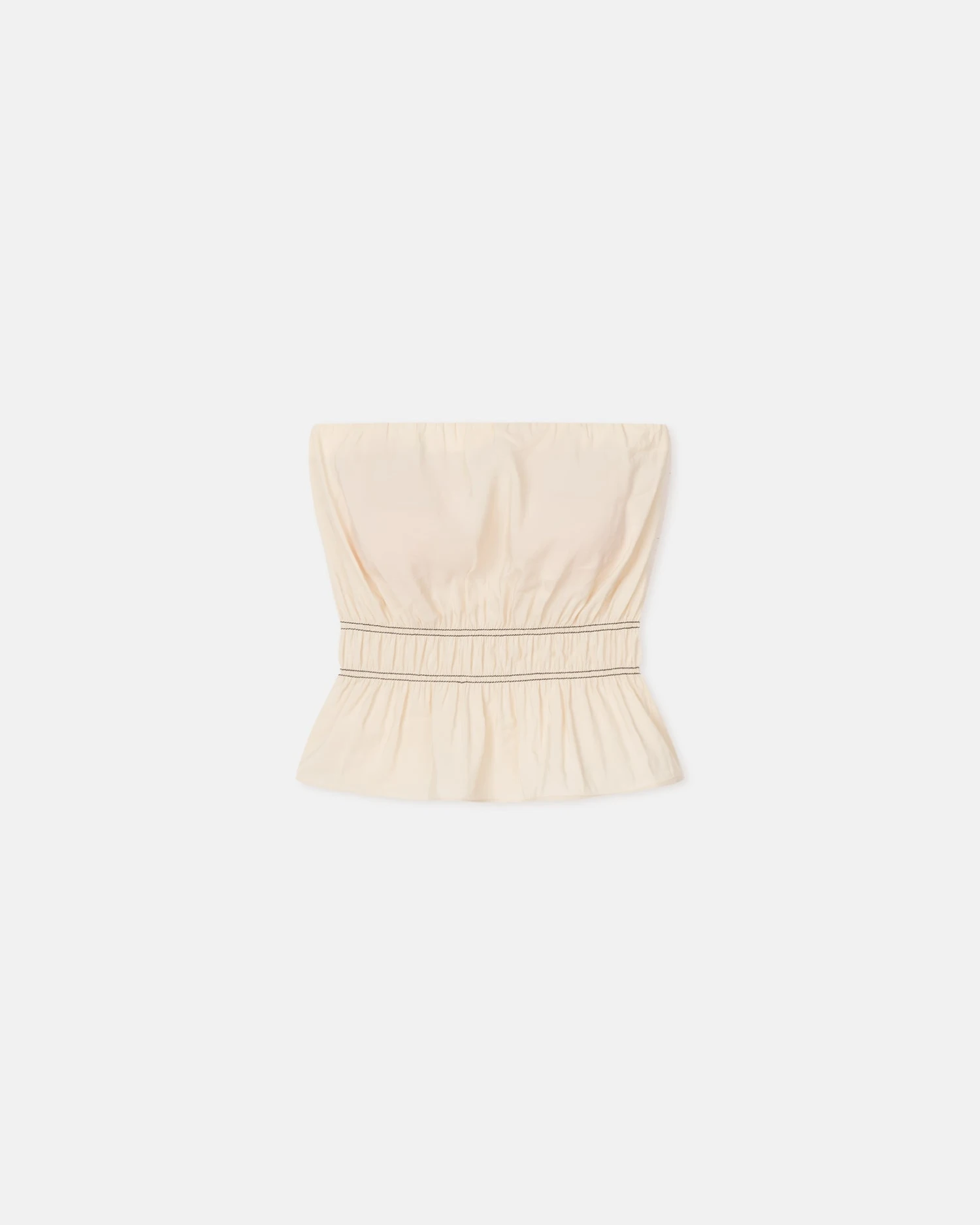 The Rosey top balances ease and elegance. It’s made from shiny glass poplin to create the smocked shape, with contrasting stitching to highlight the waist.