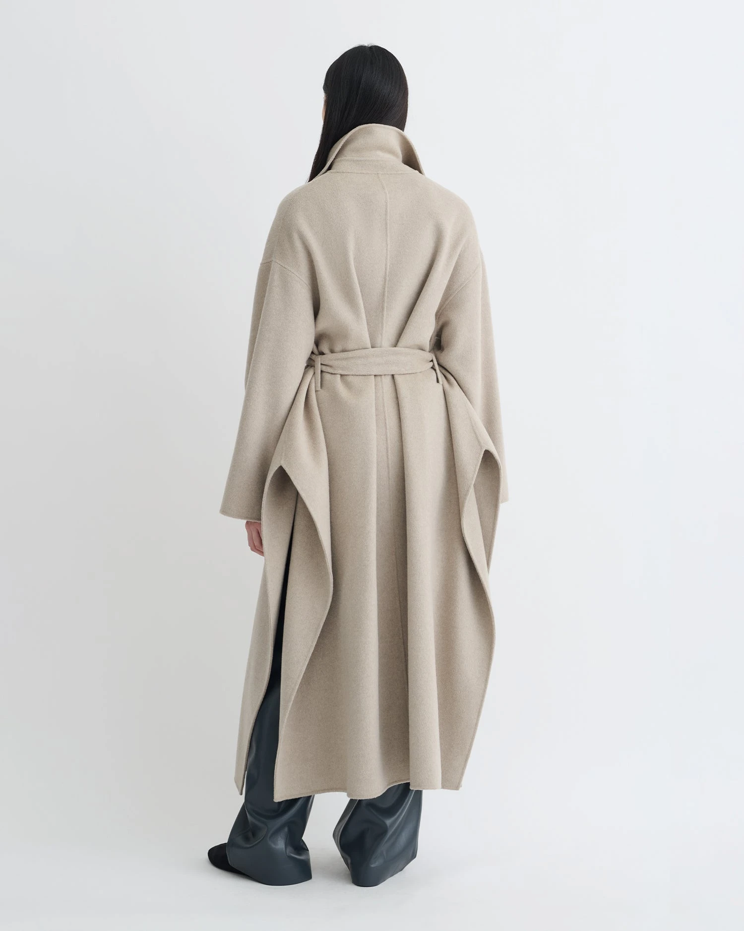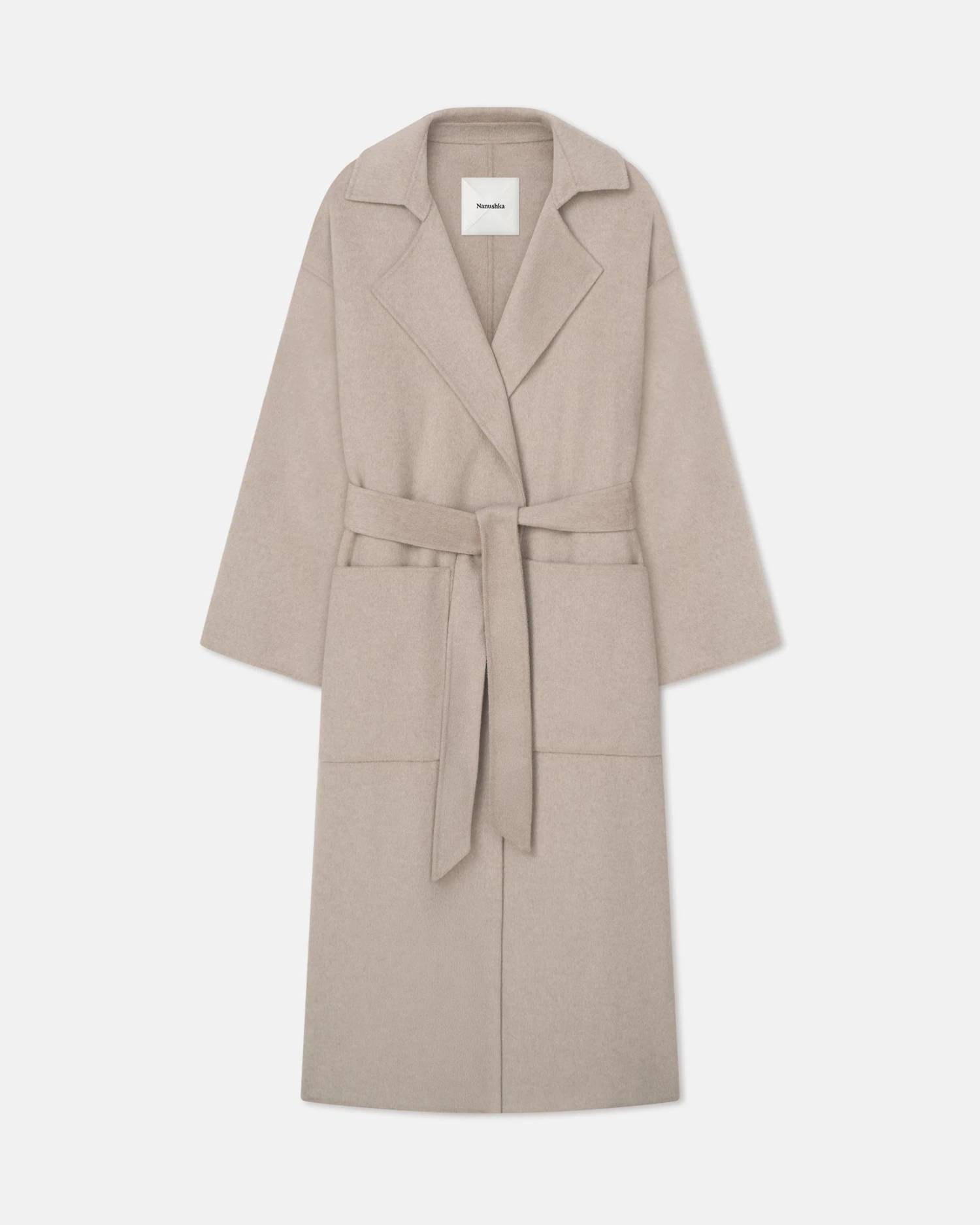 The Salima coat is crafted from the softest double wool to fluidly drape over your frame with a self-tie belt and scarf-inspired hem. In a stone hue, it will endure season after season.