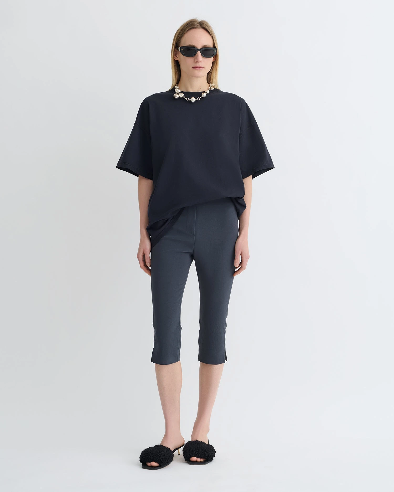 The Saoirse pants reference ‘90s office wear. They are from smooth paper jersey and have a fitted capri silhouette that’s the perfect counterpoint to oversized tailoring.