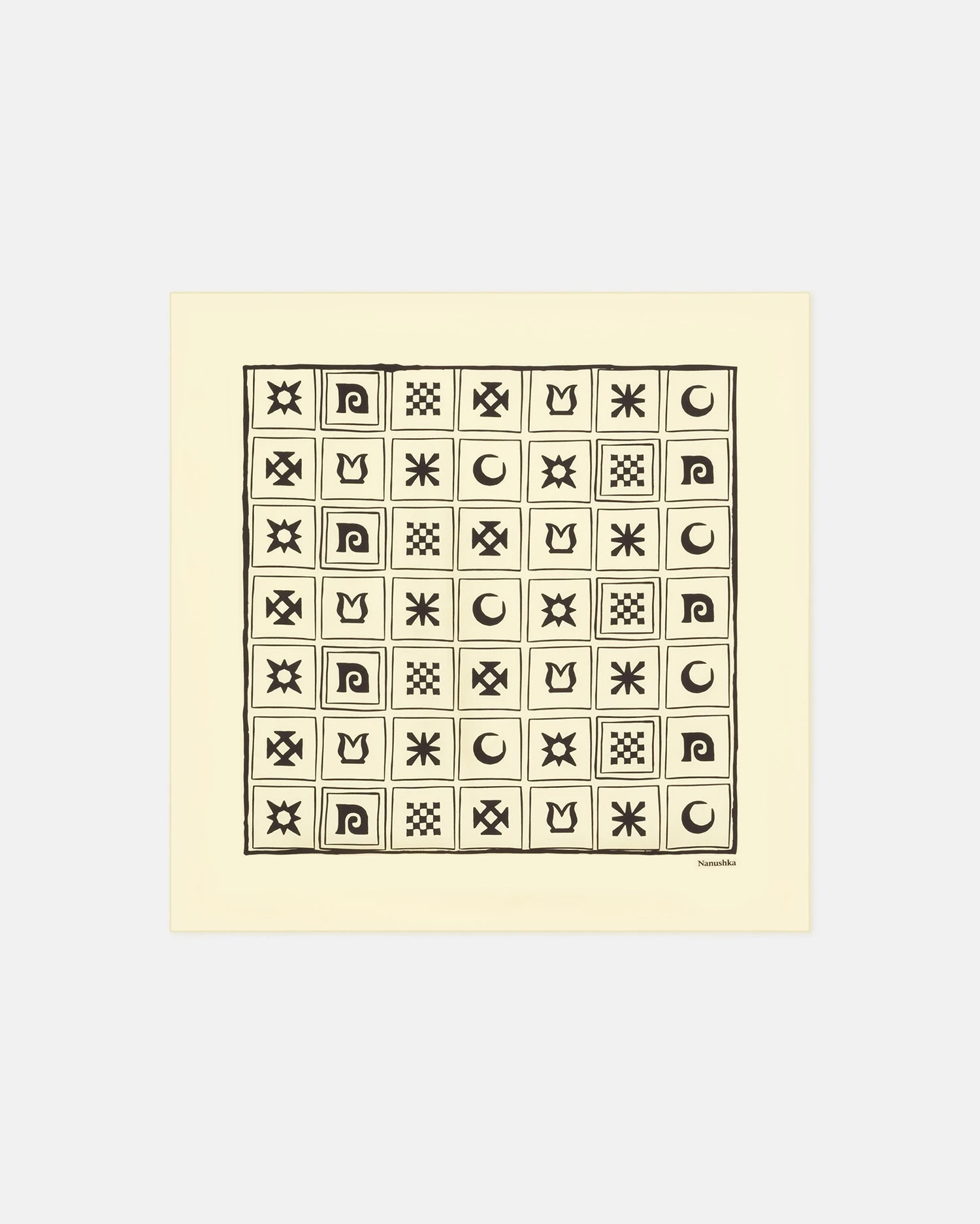 The Shoul scarf is updated with our signature moonbeam Kopjafa symbol print. Made from soft and light twill silk, the scarf has the multipurpose ability to be worn on your head, around your neck, or even looped around the top handle of your handbag.