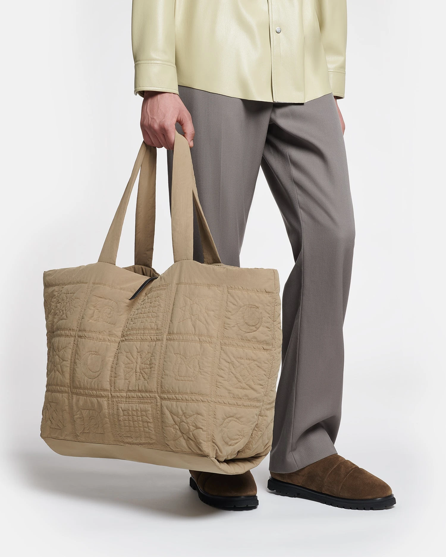 The Symbol Tote is inspired by classic sports styles from the 90s. It is crafted from functional tech poplin with a quilted texture and traditional Hungarian Kopjafa motifs. The shape is designed to be capacious yet easy to carry every day.