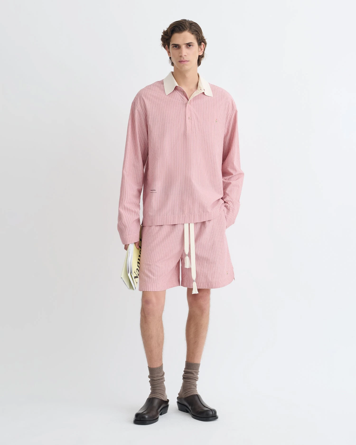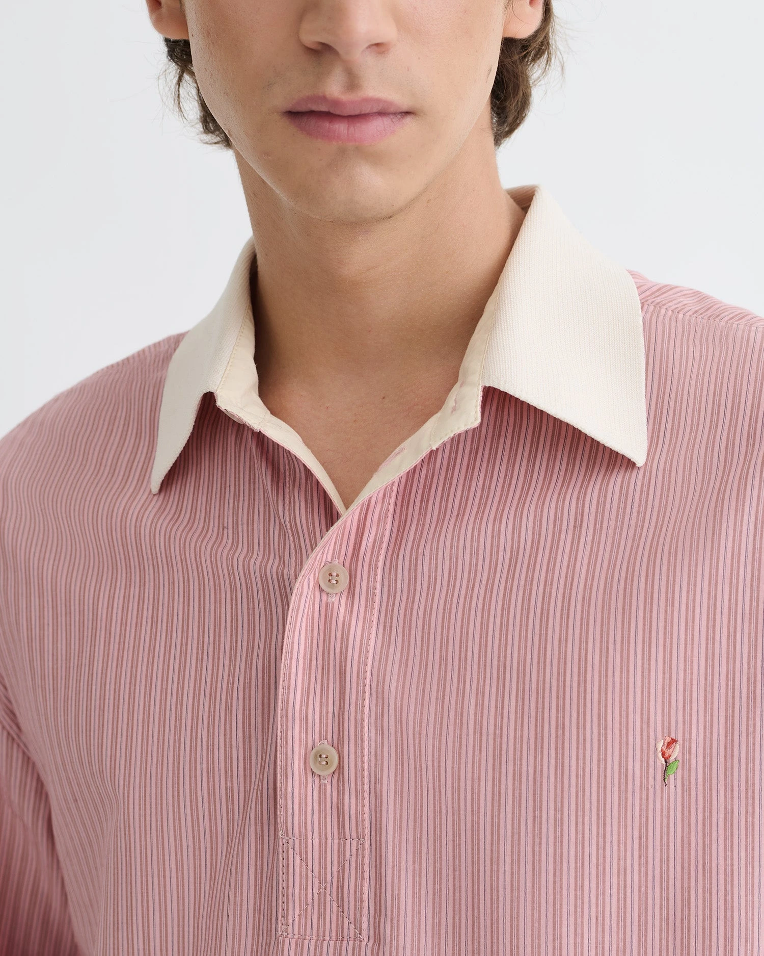 Formal wear meets sports aesthetics in the Taron top. Made from a pink striped shirting fabric, it has a polo-neck silhouette and contrasting collar.