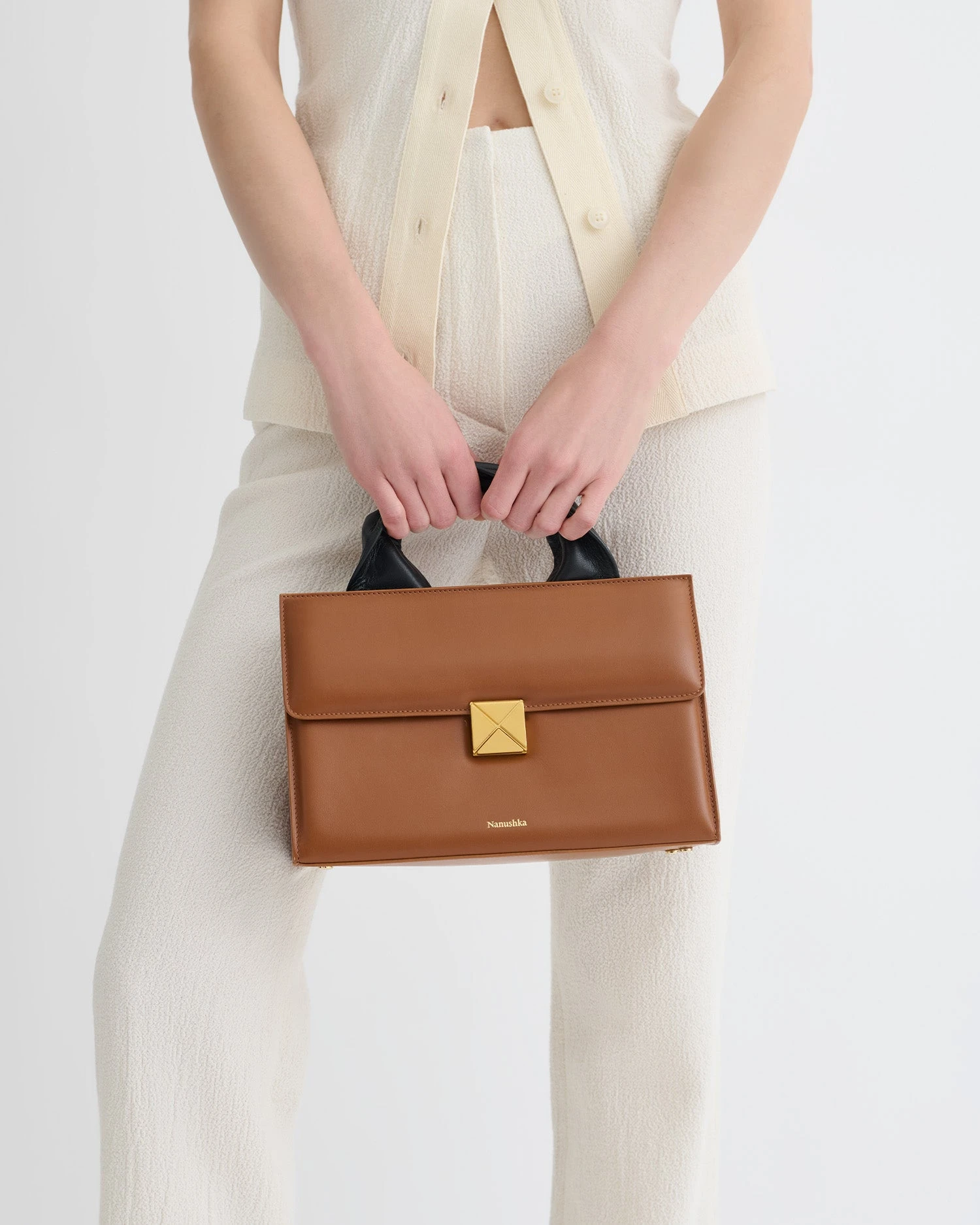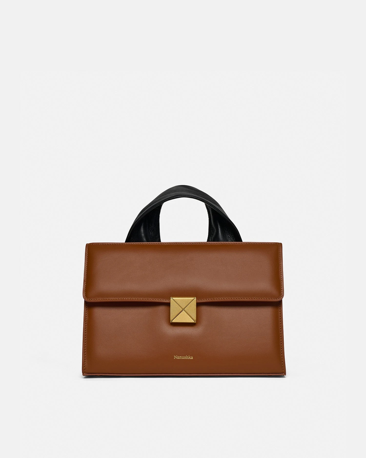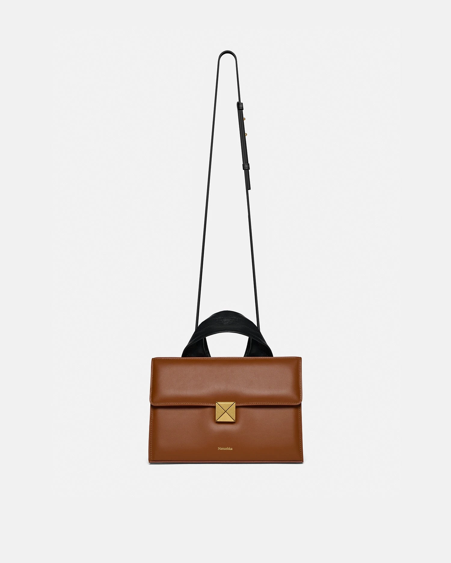 Designed from smooth leather, the SANDI Lock in tan redefines what it means to be a modern bag. Completed with a moldable wire top handle and an adjustable cross-body strap, the in-house developed gold brushed origami lock sits at the heart of the bag, showcasing an integral piece of Nanushka’s geometrical brand code.
