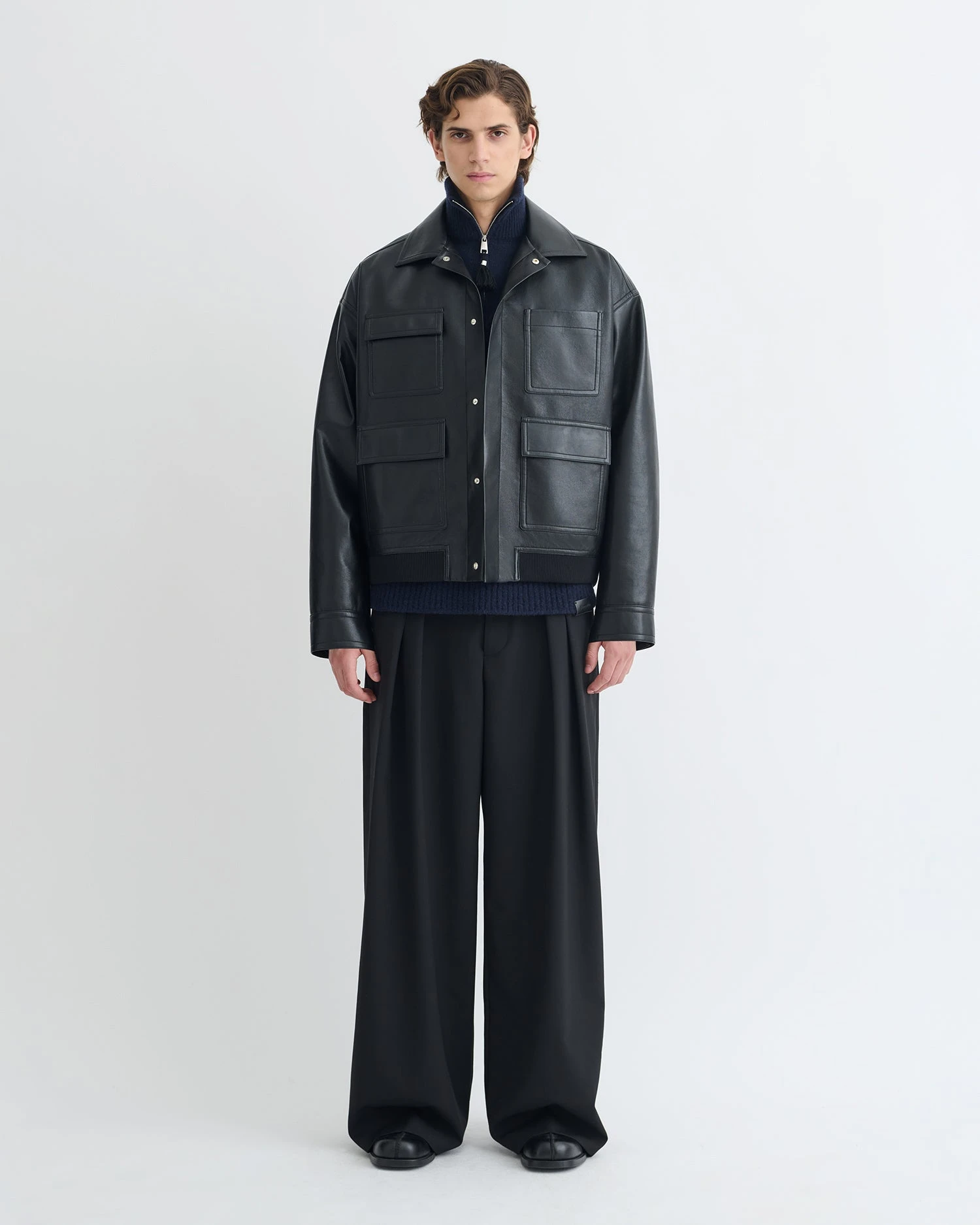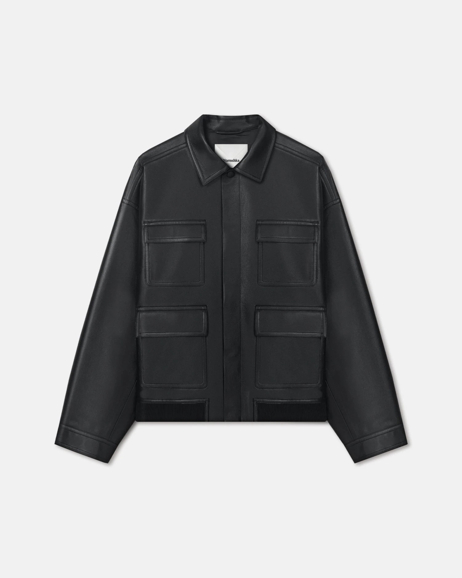 Balancing form and function, we often draw inspiration from utilitarian aesthetics. The Zubin jacket is made from black regenerated leather, and detailed with capacious pockets and an elasticated waist.